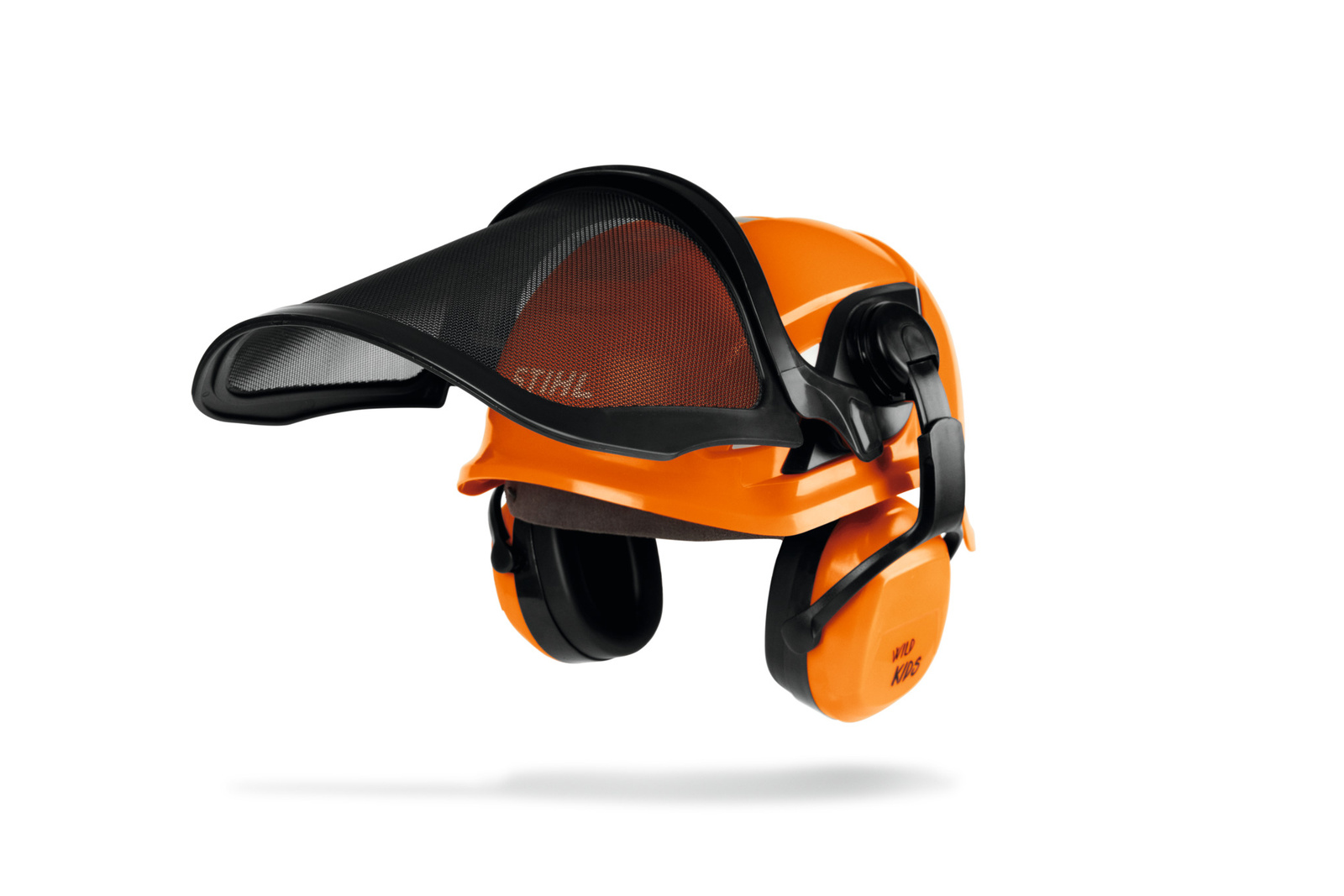 STIHL, tworzywo sztuczne ABS, składany wizjer, regulowany rozmiar, składane nauszniki ochronne, nie posiada funkcji ochronnych, odpowiedni dla dzieci od 3-go roku życia.