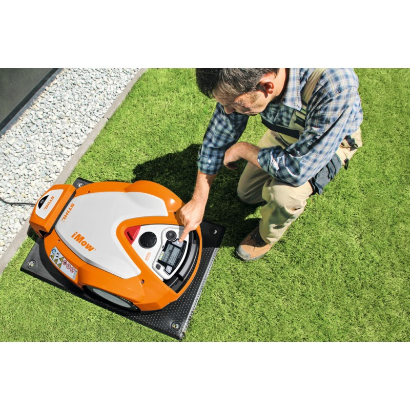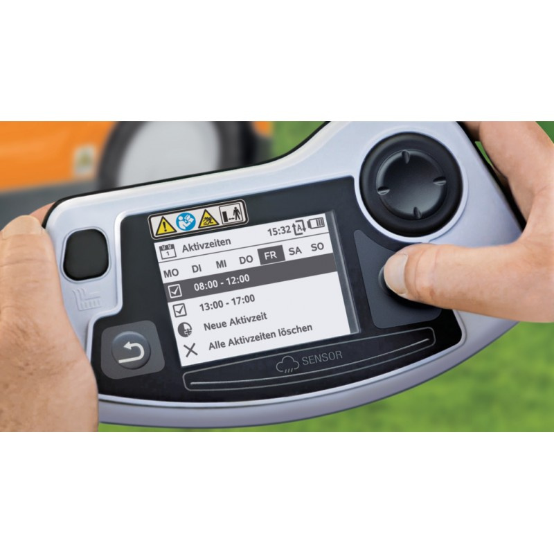 Konsola sterowania jest zintegrowana z obudową robota STIHL i posiada wyraźny wyświetlacz LCD. Wyświetlacz razem z konsolą sterującą można wyjąć z kosiarki. Umożliwia on przegląd wszystkich funkcji i danych dotyczących urządzenia. Wysoki kontrast i intensywność wyświetlania gwarantują czytelność nawet przy dużym nasłonecznieniu.