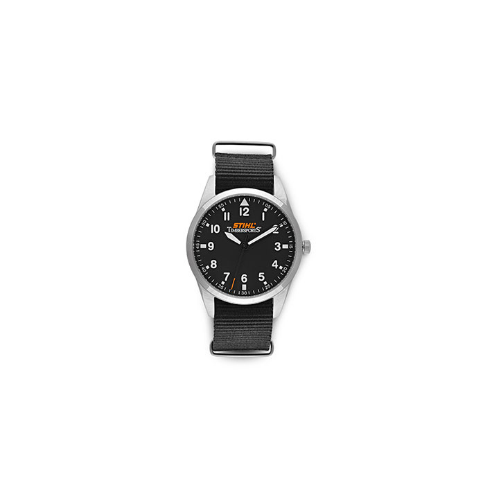 Zegarek na rękę z litej stali nierdzewnej z logo STIHL TIMBERSPORTS®, nylonowy pasek, średnica 40 mm, utwardzane szkło Crystex, wodoszczelność do 10 ATM, made by Jacques Lemans.